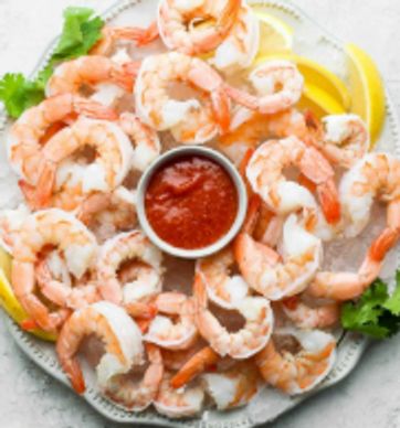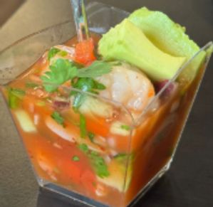 How to make: Put 3 pieces of shrimp and cocktail mix in a small cup. Finish off with a slice of avocado and a piece of cilantro.