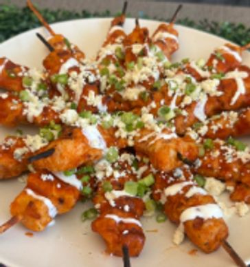 How to Build: Blue Cheese drizzle topped with Blue Cheese crumbles and scallions