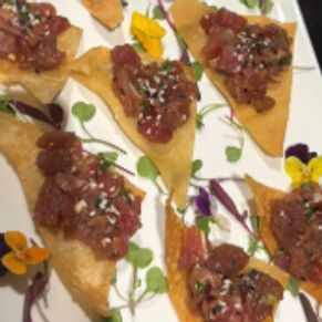 How to make: Place 1 spoonful of poke on top of a wonton chip. Garnish with a sprinkle of sesame seeds.
