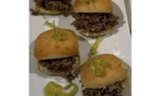 How to build: Placing brisket on the bottom half of a roll, adding a spoonful of garlic aioli on top, and closing it with the top half of the roll. Skewer a pepperoncini ring through the top with a toothpick. This item is assembled fresh by the server upon guest request. Don't make more than a few at a time, as the meat and roll will dry out.